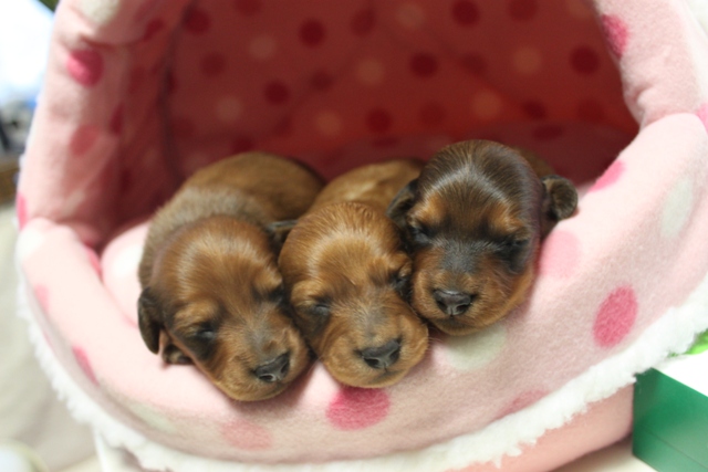ダックスの男の子誕生〜 3兄弟ですよ〜可愛いレッド☆彡 誕生日・・・・3月24日ごろ こちらもボチボチ目が開きます〜
