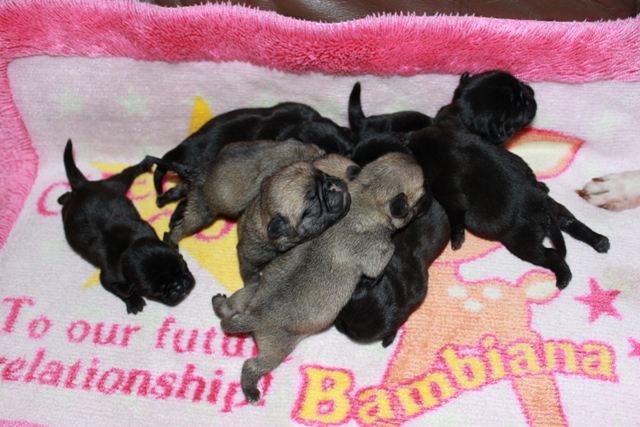 スゴーイ、ムチムチのパグの赤ちゃん誕生! ブラック・・・5頭 フォーン・・・3頭 ママはとても面倒見がいいのでスクスク育っています!(^^)!