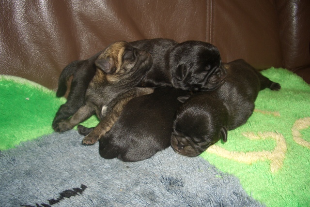 生まれたてなのに・・しっかりパグ顔しています(^_-)-☆ 毛色ブラック3頭・フォーン1頭可愛い兄妹です。 ママのそばにいて・・・みーんなでおっぱい争奪戦を繰り広げています。 しっかり育って可愛いパグっ子になることでしょう(*^_^*) 見学は少しお待ちください〜 |