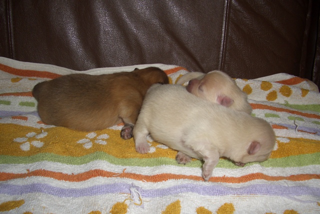ムッチリしたチワワの赤ちゃん〜 なんだかみんな3頭兄妹なんですぅ(^_-)-☆ こちらもママのおっぱいをたくさん飲んで元気に育ってます。 まだ目が開いてないけど・・・ きっと可愛いぞ〜 |