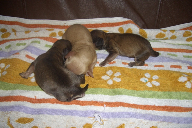 これまた可愛いダックスですぅ〜 3頭兄妹ですね(*^_^*) 元気におっぱい飲んで、寝ておっぱい飲んで・・・ の繰り返しで・・\(^o^)/ ムチムチ育ってます〜 |