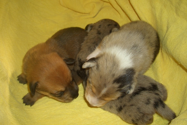 変わった毛色の子が生まれました! 母・・Mダックス 父・・ポメラニアン まだ一週間くらいなので、お顔がはっきりしないけど・・ きっと可愛い子だと思います。 |