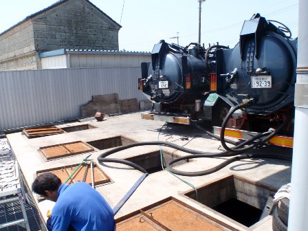 今年も、毎年恒例の油水分離装置の清掃をしました。 油水分離装置とは、工場から出る廃油や排水が工場の外に流れ出るのを防止するための装置で、 工場の下に、特大サイズの水槽が4つも埋まっています。