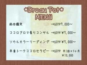 ココロアロマのセラピーサロン Dream Potストレス社会と言われる現代。多くの方が、日常生活や仕事で色々な悩みや不安をかかえていらっしゃいます。 言われてみたら、思い当たる!という方もいらっしゃるかもしれませんね。 □ 素敵な恋と巡り会えない。 □ 自分の魅力が何かわからない。 □ いつも、我慢・犠牲になる生き方を選んでしまう。 □ 何となく社会に馴染めない。 □ 自信が無く、どうせ私なんか!と思ってしまう。 □ どうして自分らしく生きられないのだろう。 □ 人生の目的が見えない Dream Potでは、ココロアロマやソウルカラーリーディングなど、本来の自分に気づくメニューをご用意しています。